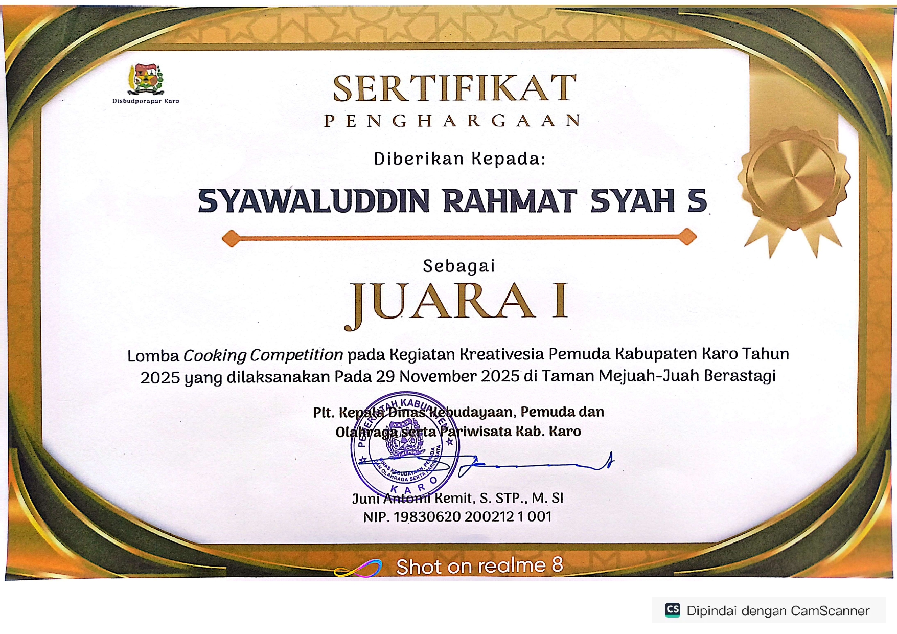 Meraih Juara 1 dalam ajang Lomba Kreasi Olahan Makanan – Semarak Nasional Pendidikan Masyarakat Ke-4, yang diselenggarakan oleh Fakultas Ilmu Pendidikan Universitas Negeri Medan pada tanggal 28 November 2025. Lomba ini mengusung tema “Pendidikan Masyarakat sebagai Media Transformasi untuk Mencetak Generasi Literat, Berdaya Saing, dan Berorientasi Global”. Peserta merupakan mahasiswa Prodi Pendidikan Tata Boga UNIMED.